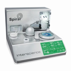 Accelerated bacterial enumeration. Fast spiral plating of Petri dishes replacing up to 4 dilutions / platings. A set volume of the sample is spread in a spiral pattern with logarithmically decreasing volume on the surface of the petri dish : the dish is divided into defined sectors where the volume given is precisely known. Sensitivity from 30 to 10