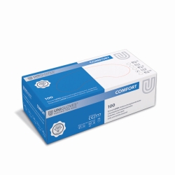 No estériles, hipoalergénicos. Sin polvo. Con puño enrollado y superficie micro-rugosa. Testados por el TÜV, AQL 1.5. Se suministran en una caja dispensadora que contiene 100 guantes. EN 455 T 1-3, CE. Cat. I 0b De acuerdo con EN ISO 374-1:2016/Tipo C, EN ISO 374-5:2016