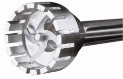 R 50 "high speed" stirring shaft Using the R 50 stirring shaft, the T50 digital is quickly converted into a high speed stirrer. 700W power and 10000rpm are provided for rapid mixing, dissolving, and breaking up pigment agglomerates. The conical shaft is supported by means of ball bearings, the mixing elements have a screw connection. For operational safety a protective cage is fitted around the mixing element. S 50 N - W 80 SMK Jet mixer head For shortening mixing and dissolving times. The vertical flow and the high tangential speed, up to 10000rpm, ensure intensive mixing. The head is used for adding gases or liquids, for lump-free suspension of difficult to dissolve powders or for dissolving sedimented, accreted substances. S 50 N - W 65 SK Cutting head To crush large pieces (up to 50mm) of fibrous materials, such as plant matter, vegetables and fruit.