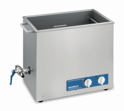 Modular range with 6 standard tank capacities in 4 versions (without heating, without ultrasonic on request). For cleaning and rinsing. With integrated ultrasonic generator. Frequencies: 25 kHz (models up to RM 110) or 40 kHz (rest of range). For 220-240 V, 50/60 Hz (RM 110: 210 UH, 400 V, 3 ph. 50/60 Hz, Cekon plug 16 A). With 2 mm thick, stainless steel 1.4404 welded tank. With overflow, drainage outlet and timer 1 to 15 min or can be set for continuous operation. With heating, adjustable temperature range from 30 to 80 °C.