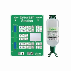 Estación lavaojos DUO para el lavado simultáneo de ambos ojos, con una botella lavaojos DUO que contiene 1000 ml de solución estéril de cloruro sódico (0,9%). Con soporte mural, pictograma adjunto y espejo. Especialmente adecuado para el lavado rápido de los ojos en lugares de trabajo pequeños.